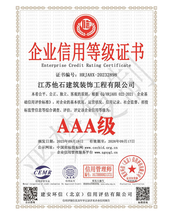 江蘇他石建筑裝飾工程有限公司成立于2007年,經過多年的發(fā)展積累,已發(fā)展成為一家以建筑裝飾設計和施工為主體,融電子與智能化、消防設施、房屋建筑、特種工程、展覽館設計與施工等為一體的專業(yè)化建筑企業(yè),是江蘇省裝飾協(xié)會會員單位、淮安市裝飾協(xié)會副會長單位、淮安市建筑業(yè)協(xié)會會員單位、中國展覽館協(xié)會會員單位。